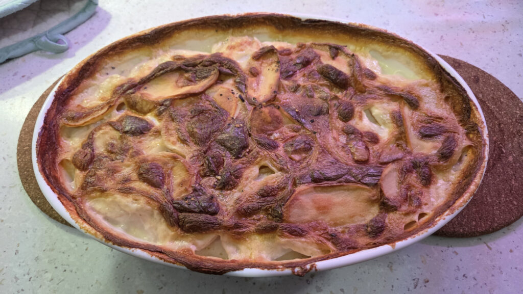 - Étaler une couche de pommes de terre dans le plat, puis arroser du mélange crème/lait/épices